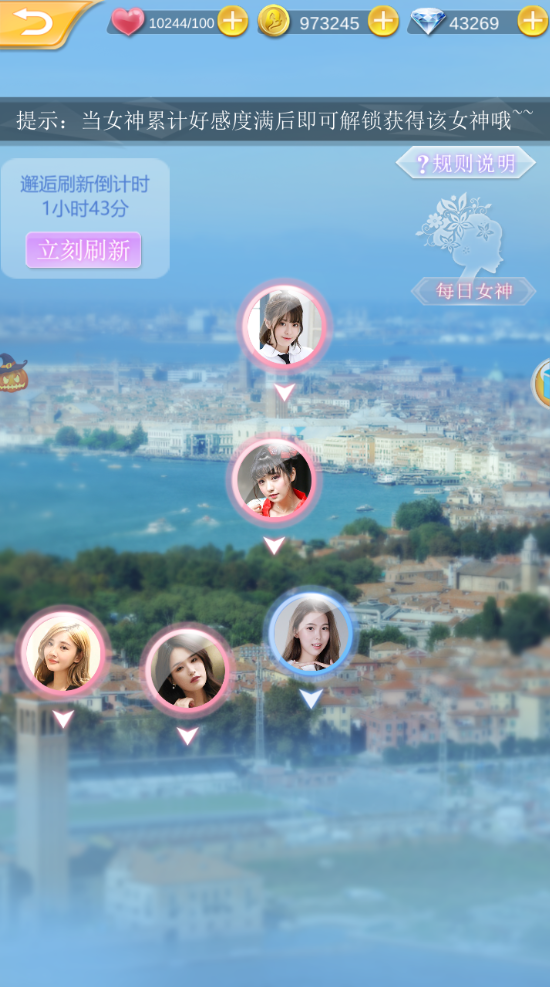 邂逅系統是《戀愛日記》所具有的獨特的玩法之一,讓你在與女神邂逅的過程中獲得女神的好感,當好感度滿瞭之後就可以獲得該女神瞭。